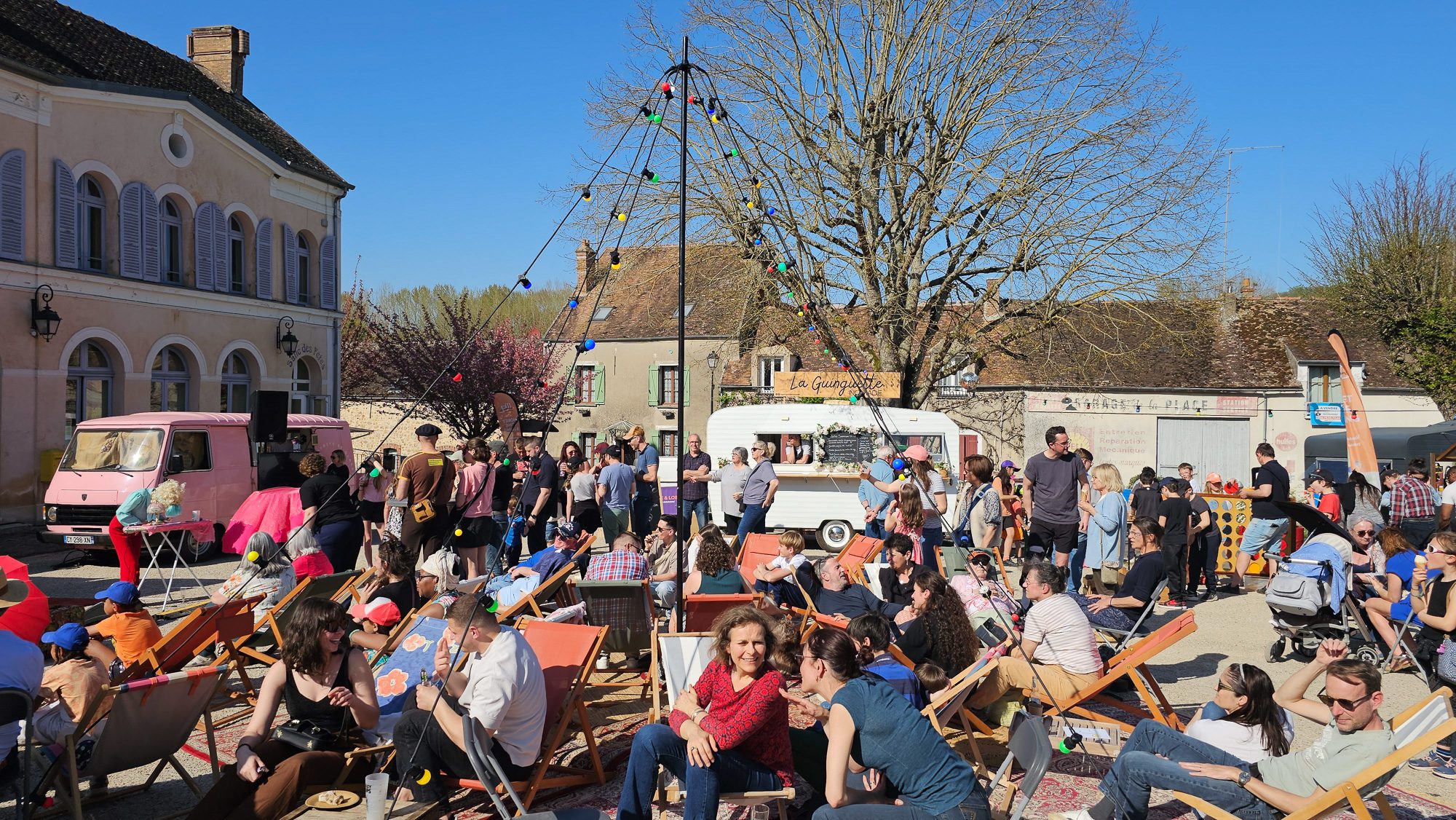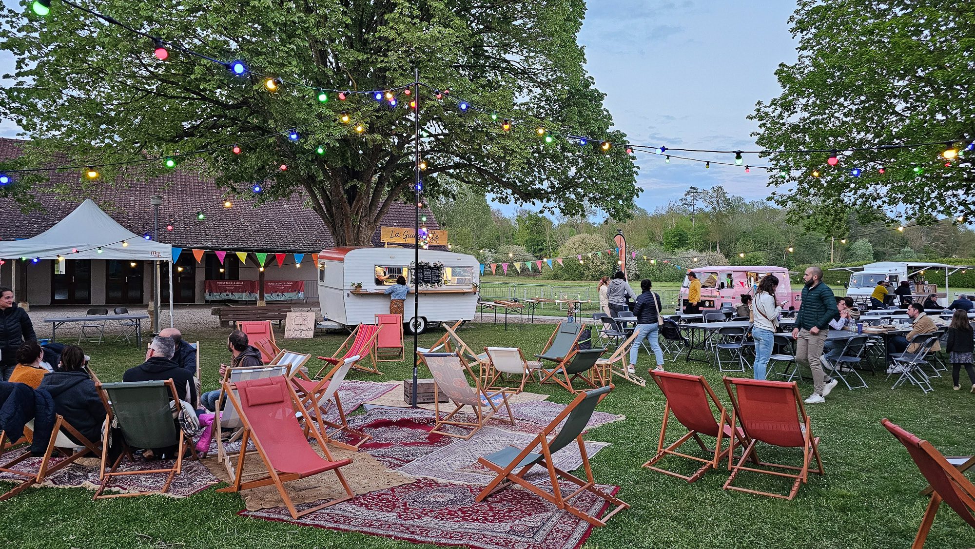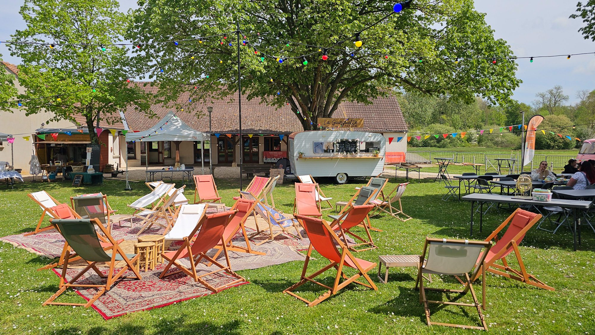 – Tapis, tables basses, fanions, boule à facettes… une vraie scénographie de guinguette .